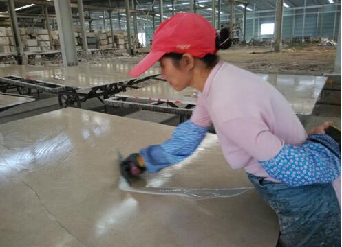 5.加工:膠在未完全固化前,應(yīng)將石板靜置平放,切不可疊放。多余的膠,未固化前可用刮刀去除。打磨拋光等操作應(yīng)在膠水完全固化后才能進行。
