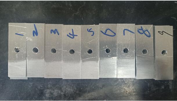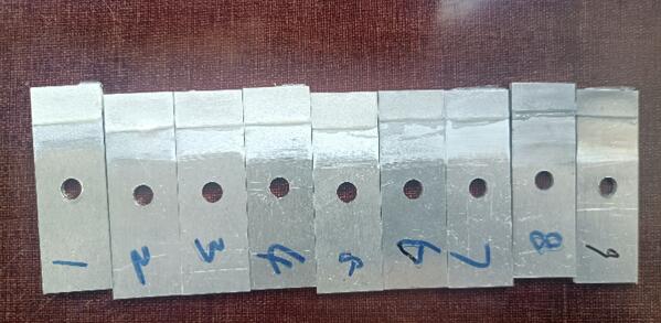 我們選取的砂布目數(shù)為:60、120、180、320、600、800、1200、1500、2000。我們分別按1-9給這個試片進(jìn)行排序。1代表60目,2代表120目...,我們能從打磨痕跡看出,號數(shù)越大的,打磨越細(xì)膩,1500和2000目砂紙打磨的硬鋁試片基本能呈現(xiàn)出鏡面光澤。(下面的圖片拍攝可能是反光問題,不能看出差異,實物實際是很能看出來區(qū)別的,不信你試試,哈哈)