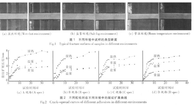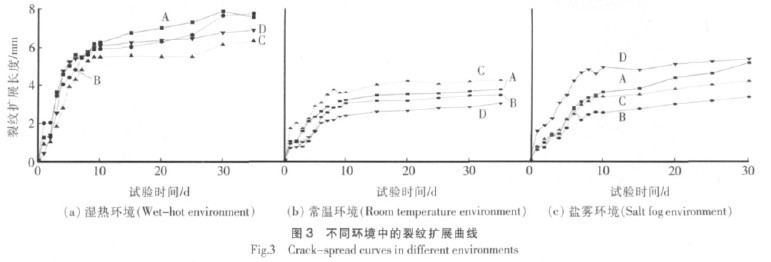 依次為 D>A>B>C 常溫環(huán)境中,種規(guī)格膠粘劑的裂紋擴(kuò)展由快到慢依次為 C>A>B>D; 鹽霧環(huán)境中,種規(guī)格膠粘劑的裂紋擴(kuò)展由快到慢依次為 D>A>C>B。