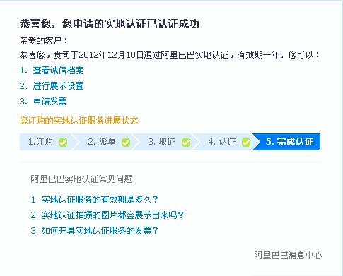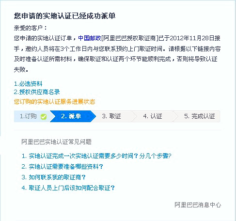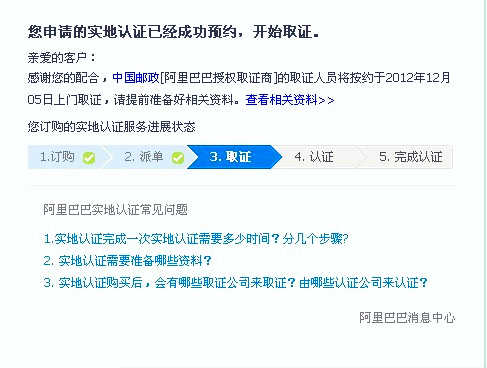 阿里巴巴實地認證服務分為取證與認證兩個環(huán)節(jié),取證服務有特定的取證商:中國郵政和中誠信;認證服務有特定的認證商:中誠信,杭州中德,北京匯華。如果你那的材料齊全,在上門取證后的16個工作日內(nèi)會有認證結(jié)果(認證成功或認證失敗),并且到時會有旺旺浮出提醒。