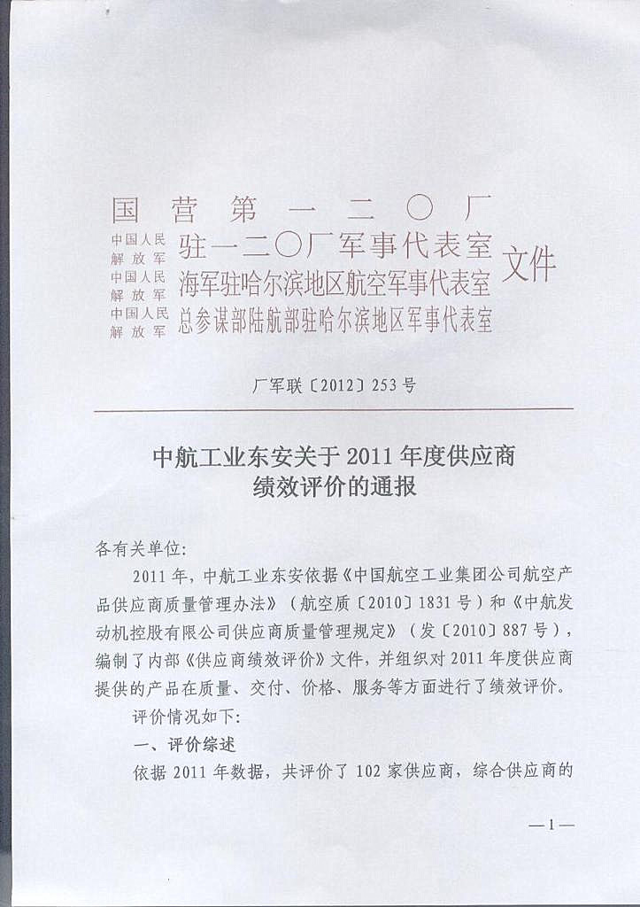 因高溫密封膠產(chǎn)品榮獲國(guó)營(yíng)二0廠(中航工業(yè)東安發(fā)動(dòng)機(jī)集團(tuán)公司)2011年度優(yōu)秀供應(yīng)商稱(chēng)號(hào)