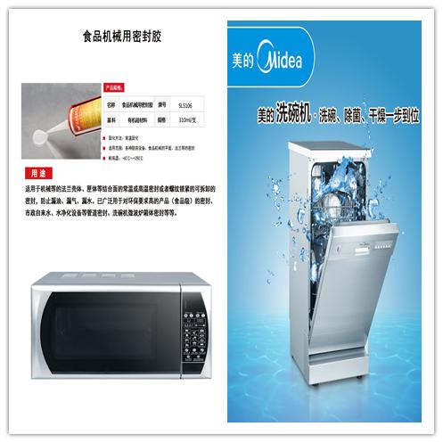 美的生產(chǎn)的洗碗機(jī)上就選用了世林膠業(yè)生產(chǎn)的SL5106食品級(jí)耐高溫密封膠,用在產(chǎn)品的間隙處,完全解決了耐高溫,防水,防塵,耐候性強(qiáng),可拆卸等問題。